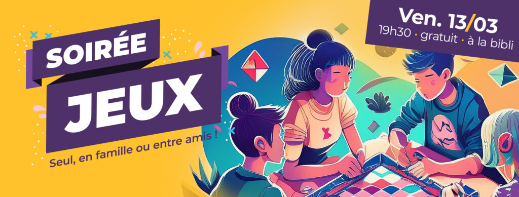 đČ Vendredi 13 mars, dĂšs 19h30, venez jouer Ă la bibli ! Seul, en famille ou entre amis, ce sera lâoccasion de se rencontrer et de passer une soirĂ©e dans une ambiance conviviale et dĂ©tendue.