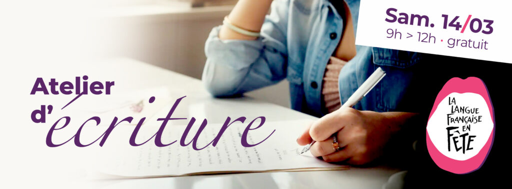 Samedi 14 mars, de 9h Ă 12h, rejoignez-nous pour un atelier dâĂ©criture, organisĂ© dans le cadre de lâopĂ©ration « La langue française en fĂȘte ». Ă partir de « Dis-moi dix mots dâun monde Ă venir », venez explorez, jouez et Ă©changez avec les mots.