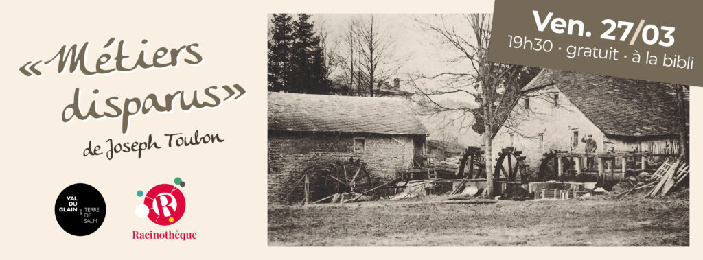 Vendredi 27 mars Ă 19h30, l’asbl « Glain et Salm, Haute Ardenne », en partenariat avec la RacinothĂšque, vous invite Ă la prĂ©sentation du nouveau livre de Joseph Toubon : « MĂ©tiers disparus ».